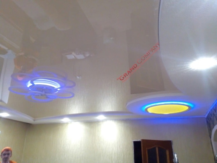 Светильники и подсветка: Глянцевые натяжные потолки часто дополняются различными видами светильников и подсветкой. Встроенные светильники, светодиодные полосы или другие источники света помогают создать эффектное освещение и подчеркнуть блеск поверхности.